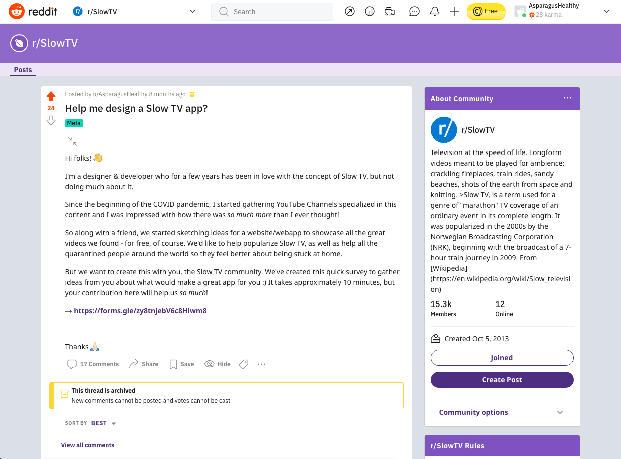 This project was co-created with the Reddit Slow TV community, where we understood the whys and hows of those users. We posted a survey asking people to help me build this app.