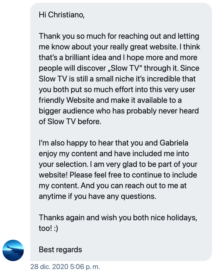 For a long time I’ve been in love with the concept of Slow TV, and from the beginning of the COVID pandemic I started collecting some YouTube channels I was shocked with how much amazing stuff was out there. I started sketching ideas for a webapp that would help promote all this amazing content, something with a frictionless experience that would attempt to fix once and for all the choice paralysis present in so many video streaming platforms these days.