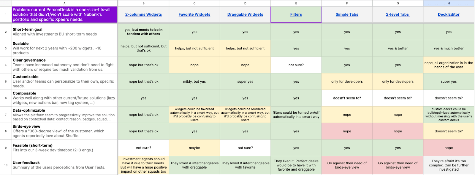 A snapshot of our Decision Matrix, a framework for prioritizing ideas based on multiple dimensions. Click to see it larger.